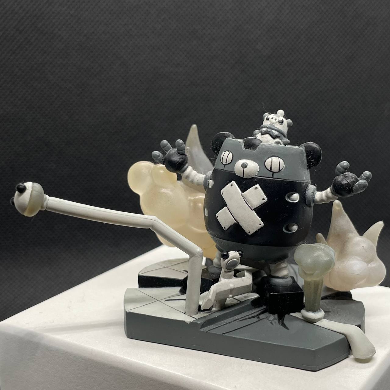 DescriptionA detailed diorama figure from the "Fight!! Panda-Z" edition of the Mini Figure Collection 02. It features the "evil" roboanimal Black Ham Gear (a dark-colored robot with a white cross on its chest) piloted by the small Dr. Gangarly figure in the cockpit.