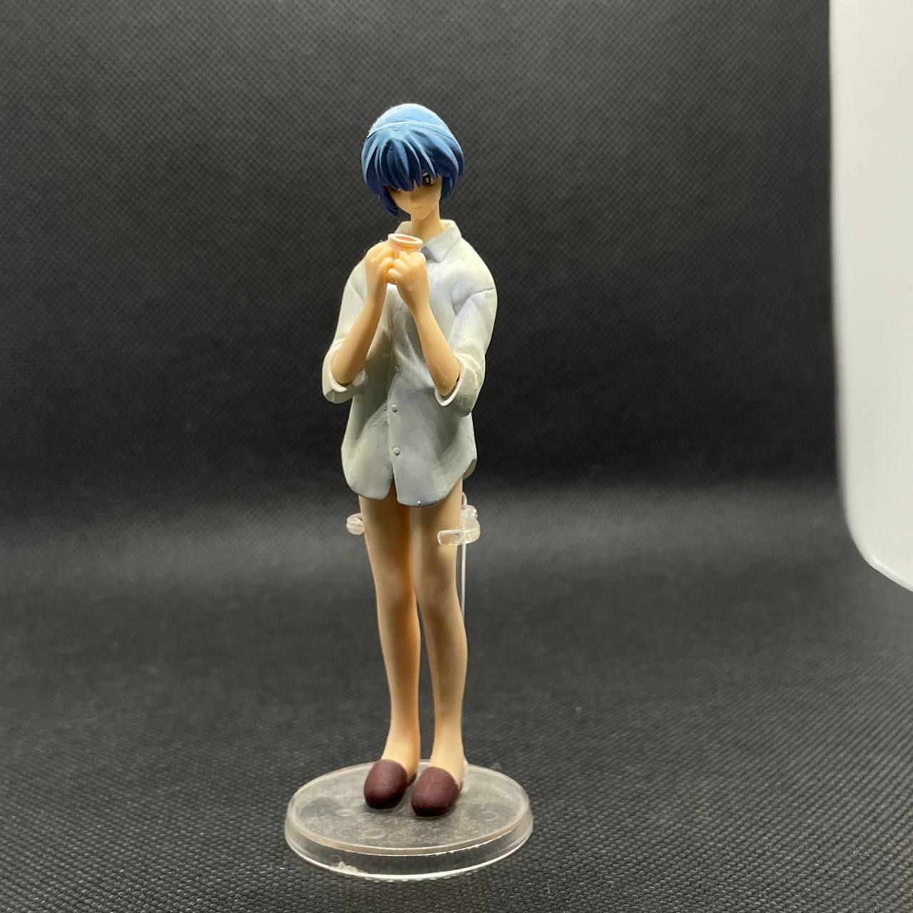 説明Figure of Rei Ayanami in casual white shirt and brown slippers, posed with hands clasped in contemplative stance.